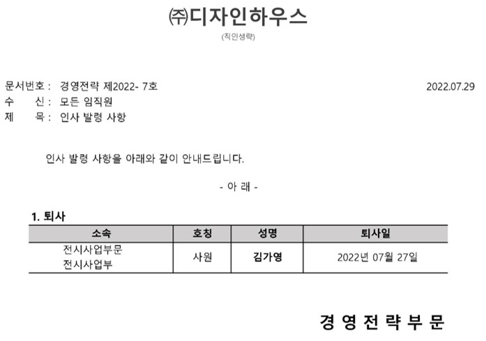 인사 발령 사항 (경영전략 제2022- 7호)