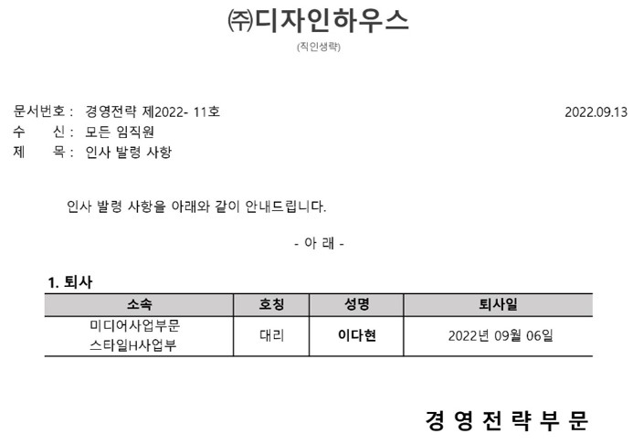 인사 발령 사항 (경영전략 제2022- 11호)