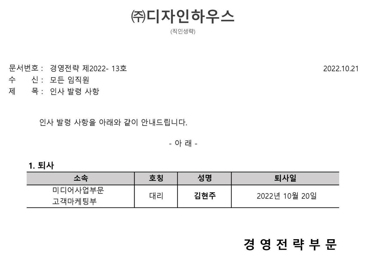 인사 발령 사항 (경영전략 제2022- 13호)