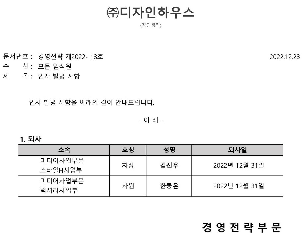 인사 발령 사항 (경영전략 제2022- 18호)